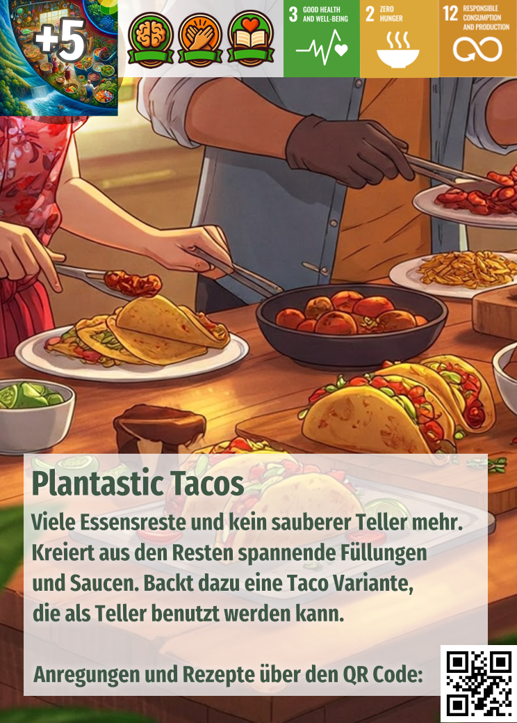 The collected cards are played live and in real-time in real life. Each card contains a concrete ‘Quest,’ a mission and task from the diverse thematic areas of our ‘Food Systems.’ When a Quest has been successfully completed, experience and skill points are recorded in the printed Adventure Character Journal (ACJ!), and the relevant SDGs are ticked off. The player’s own character and their ‘portfolio’ of concrete actions for the transformation of our food systems thus grows over the weeks, whenever fsys is played – at school, with friends, or with family.